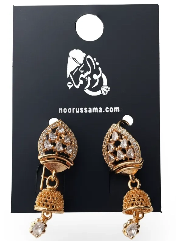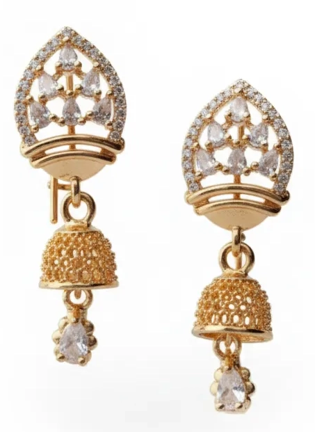 Embrace the timeless allure of tradition with a modern twist with the Majestic Teardrop Jhumka Earrings. These stunning pieces are a celebration of cultural elegance and contemporary design. The upper stud features a graceful teardrop shape, intricately framed by a sparkling pavé of stones that radiate brilliance with every turn of the head. From this elegant stud hangs a beautifully detailed jhumka bell, crafted with delicate filigree work that adds a touch of classic artistry. A single, luminous stone dangles from the center of the bell, creating a captivating focal point.