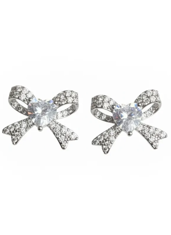 Add a touch of playful sophistication to your collection with these Charming Bowknot Stud Earrings. Inspired by the timeless symbol of a perfect bow, these earrings feature a graceful silhouette that exudes femininity and charm. The center of each bow is highlighted by a brilliant, heart-shaped stone, which acts as the focal point, capturing the light with every subtle movement. The loops and tails of the bow are meticulously detailed with a dazzling pave setting, creating a rich texture and an all-over sparkle that beautifully complements the central heart.