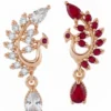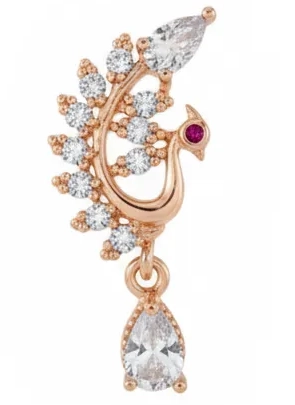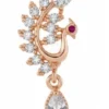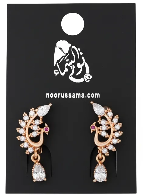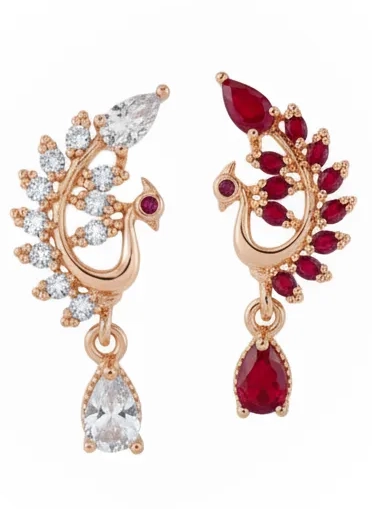 Embrace the beauty and grace of nature with these exquisite Peacock Zirconia Drop Earrings. Crafted with a stunning rose gold-plated base, these earrings are a true work of art, featuring a beautifully detailed peacock motif. The body and feathers of the peacock are intricately adorned with sparkling brilliant-cut zirconia stones, creating a dazzling display of light. A small, vibrant red stone serves as the eye, adding a touch of unique charm and contrast. Suspended gracefully from the peacock’s tail is a single, brilliant teardrop-shaped zirconia stone that sways with every movement, adding a touch of dynamic elegance.