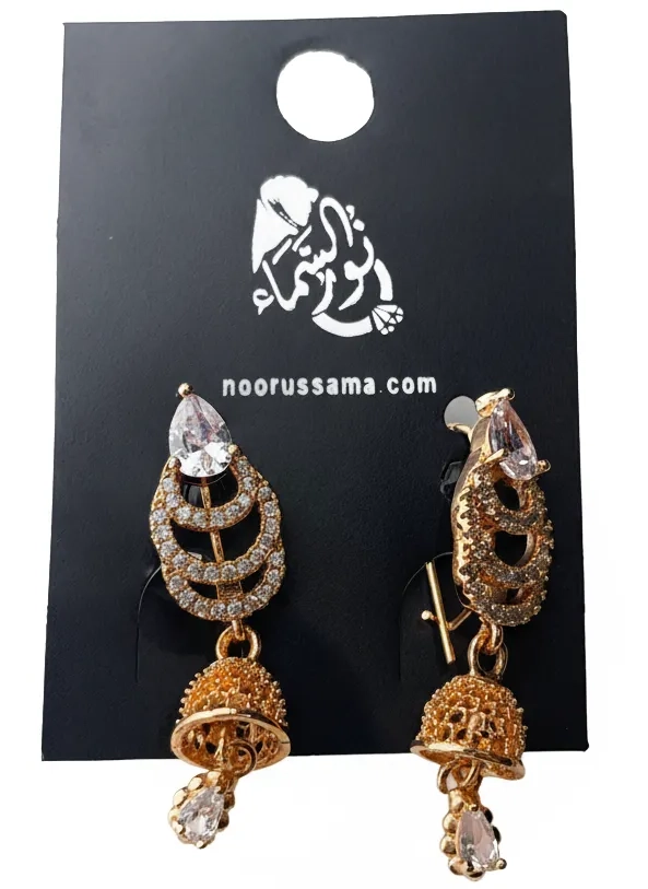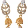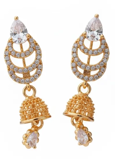 Embrace timeless elegance with these exquisite Zirconia Jhumka Drop Earrings, a perfect fusion of traditional charm and modern sparkle. Crafted with a beautiful gold-plated base, these earrings feature a captivating two-part design. The top part is a leaf-inspired stud, adorned with a brilliant pear-shaped zirconia stone and surrounded by a delicate pavé of smaller zirconia stones that catch the light from every angle. Dangling gracefully below is a classic jhumka (bell-shaped) component, intricately detailed and finished with a sparkling teardrop-shaped zirconia stone that sways with your every movement.