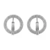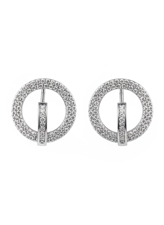 These striking earrings feature a luminous pavé-set circle with a sleek, minimalist bar drop, combining clean geometric lines with a captivating sparkle for a modern and chic look.