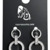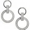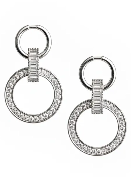 Between the two rings, a polished bar encrusted with baguette-cut crystals adds a unique textural contrast and an extra layer of sparkle. This thoughtful combination of circular forms and linear sparkle creates a visually captivating piece that is both bold and refined. Crafted to be lightweight and comfortable for extended wear, these earrings are perfect for adding a touch of contemporary glamour to any ensemble, whether for a night out or to elevate your everyday style.